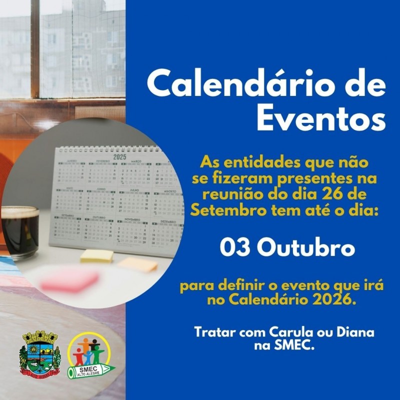 As entidades que não se fizeram presentes têm até o dia 03 de outubro para entrar em contato com a Diana ou Carula na Smec para definir o evento e dia que irá no Calendário.